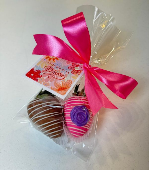 Bolsa celofán con 2 fresas cubiertas y decoradas con chocolate con 1 botón de rosa, adornada con lazo de tela y colilla personalizada