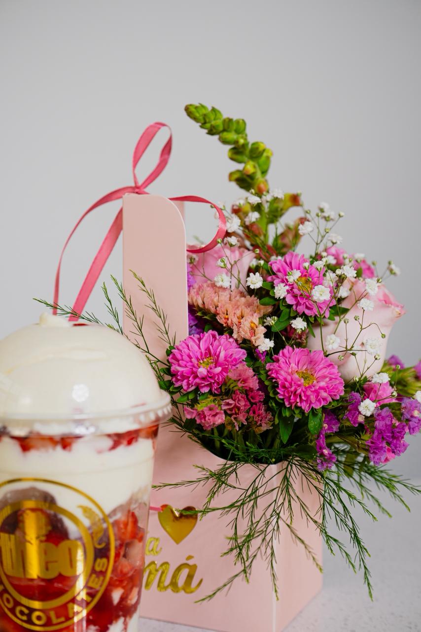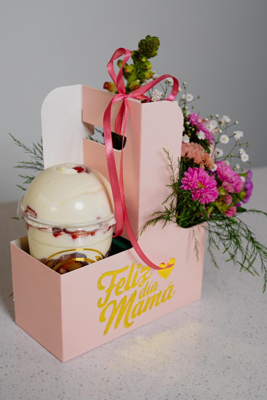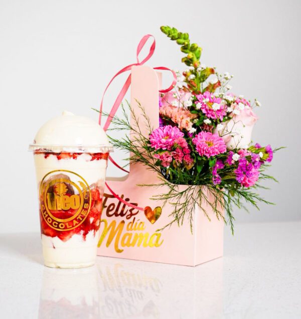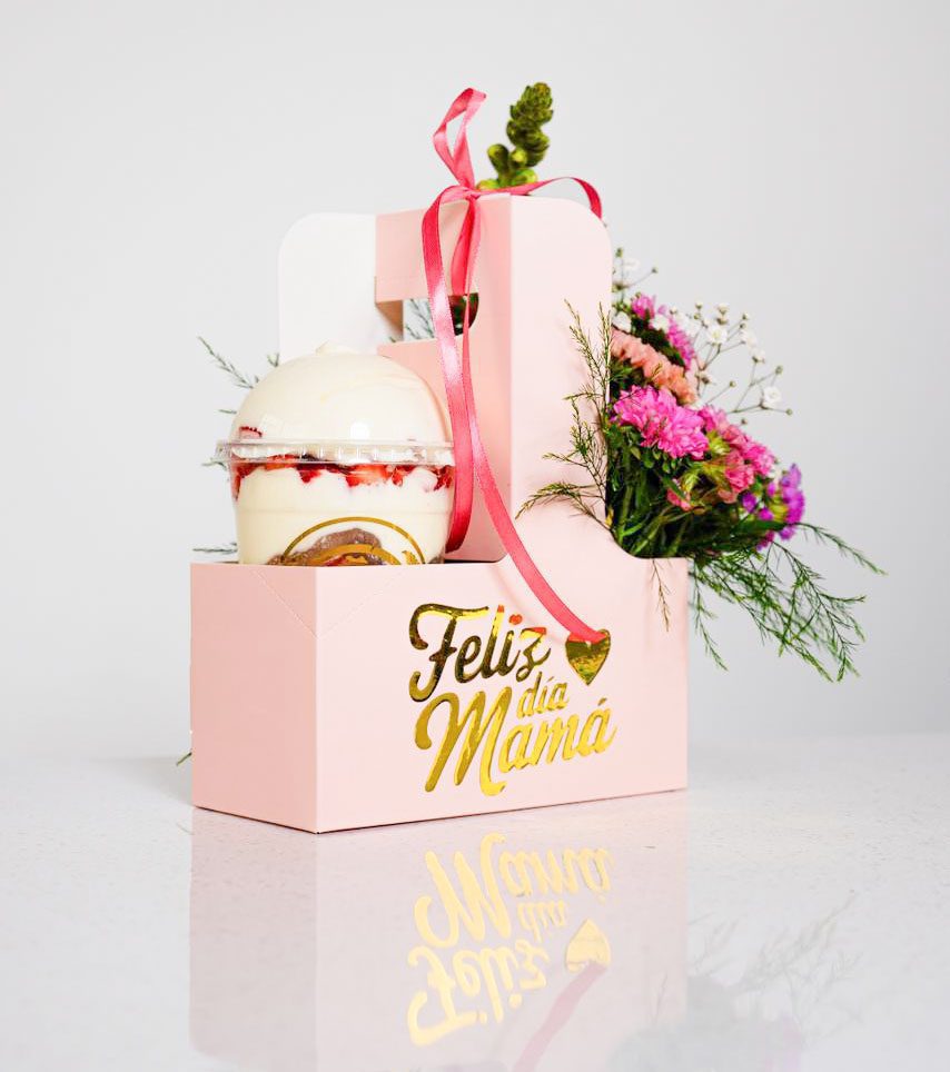 Arreglo de flores primaverales, incluye 2 rosas rosadas y flores de temporada, un delicioso vaso de fresas con crema. La caja del arreglo es de cartón rosado rígido personalizado con la frase “Feliz día Mamá”.