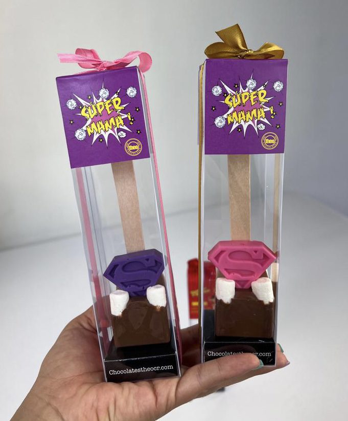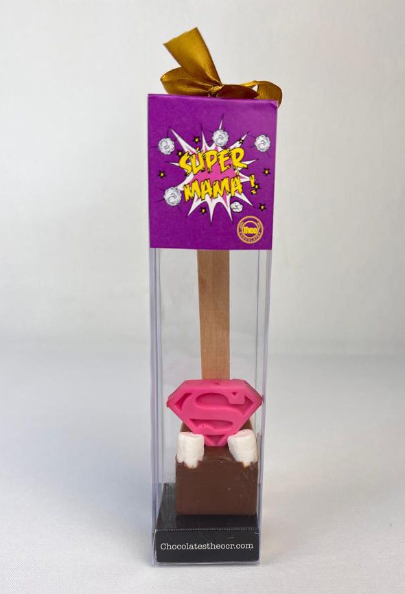 Cuchara para derretir y hacer chocolate caliente con mini marshmallows y escudo de de “Súper Mamá”