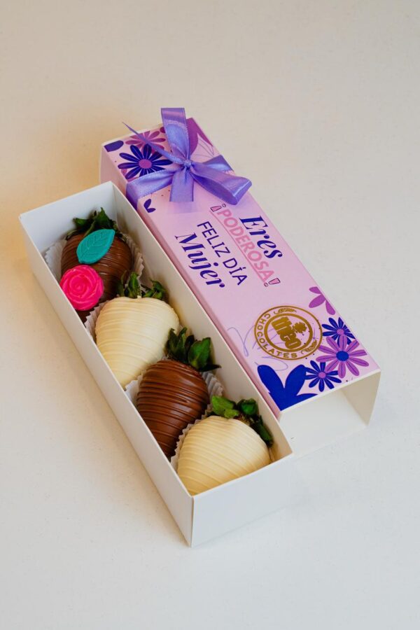 Caja con 4 fresas cubiertas y decoradas con botones de rosa y hojas de chocolate. Con colilla “Feliz Día de la Mujer”