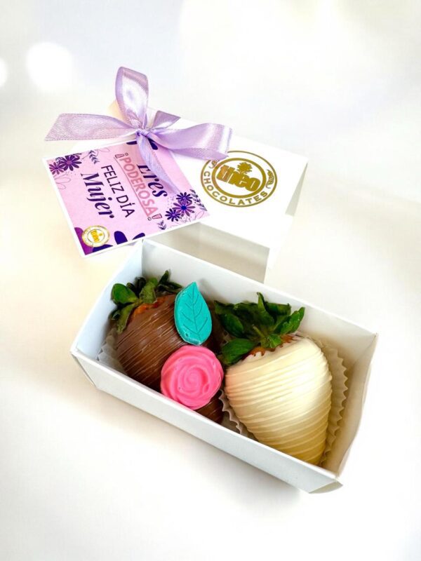 Caja con 2 fresas cubiertas y decoradas con un cactus de chocolate, adornada con lazo de tela y colilla personalizada*
