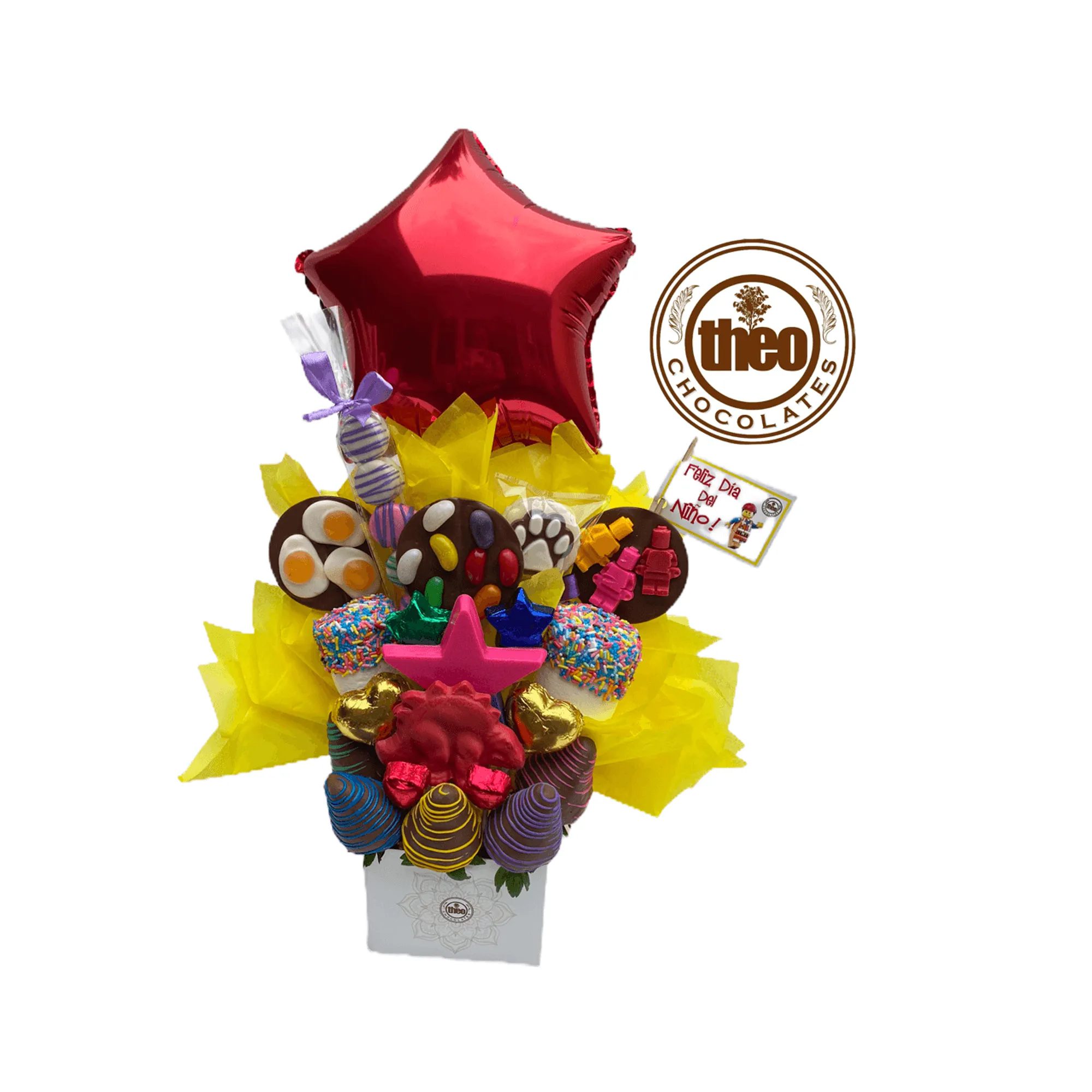 Arreglo de chocolates surtidos; Contiene 5 fresas cubiertas con chocolate, marshmallows gigantes, chocolates con figuras de lego, gomitas dulces y ácidas y un globo de 9” en forma de estrella