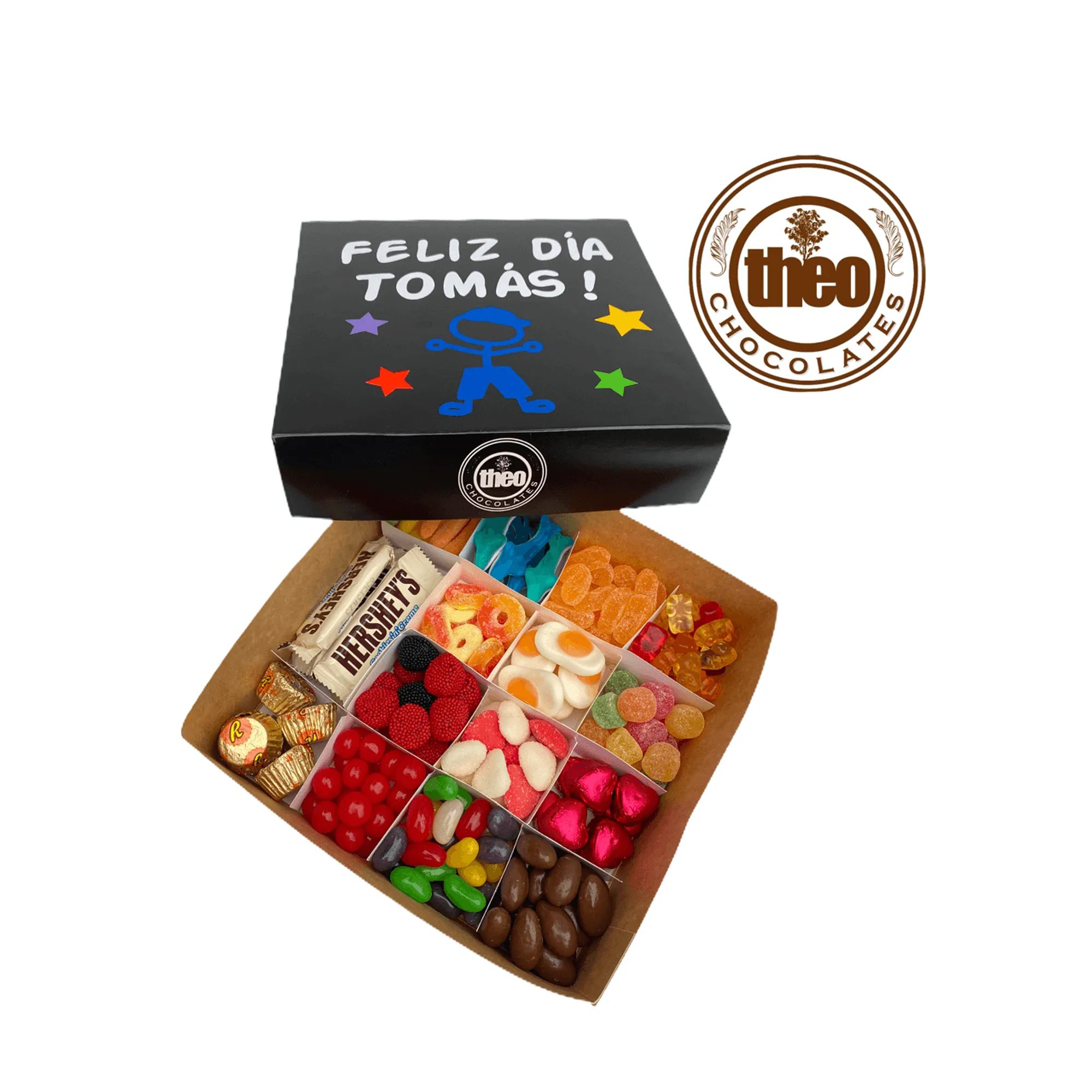 Caja variada con diferentes tipos de gomitas de sabores dulces y ácidos, almendras recubiertas con chocolate y mini Hershey´s de cookies ´n cream con la tapa personalizada con el nombre del niñ@.