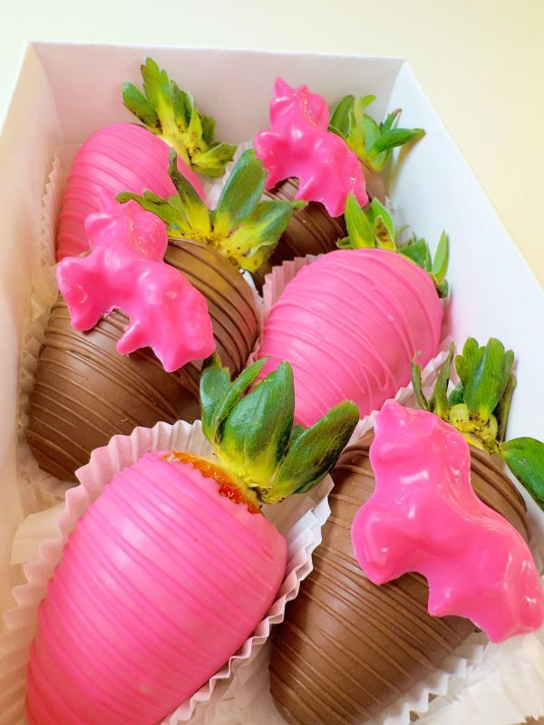 Esta caja contiene tres fresas cubiertas de chocolate rosado y tres fresas cubiertas de chocolate con apliques de unicornio en cada una de ellas.