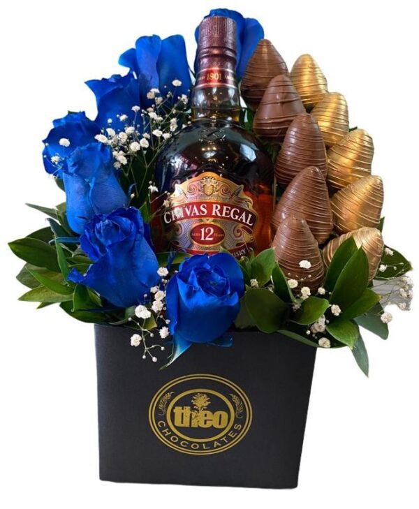 Arreglo Fresas Con Chocolate, Botella Chivas y Rosas Azules