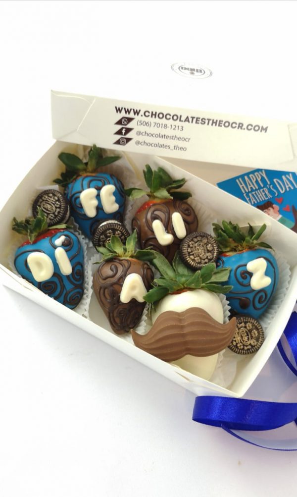 Caja blanca con 6 fresas cubiertas y decoradas con chocolate con el mensaje “Feliz día” + 1 mostacho de chocolate