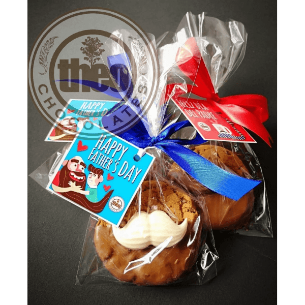 Galleta con chips, con la mitad cubierta con chocolate de leche y con un bigote de chocolate blanco adornando la galleta.