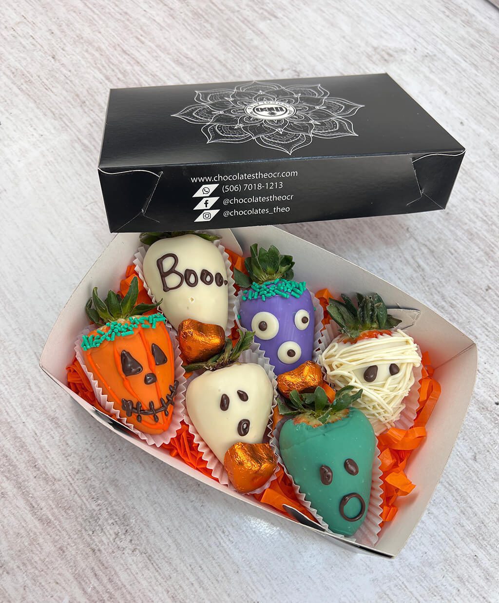 Caja con 6 fresas cubiertas y decoradas con chocolate blanco y naranja, con decoración de fantasmas y calabazas