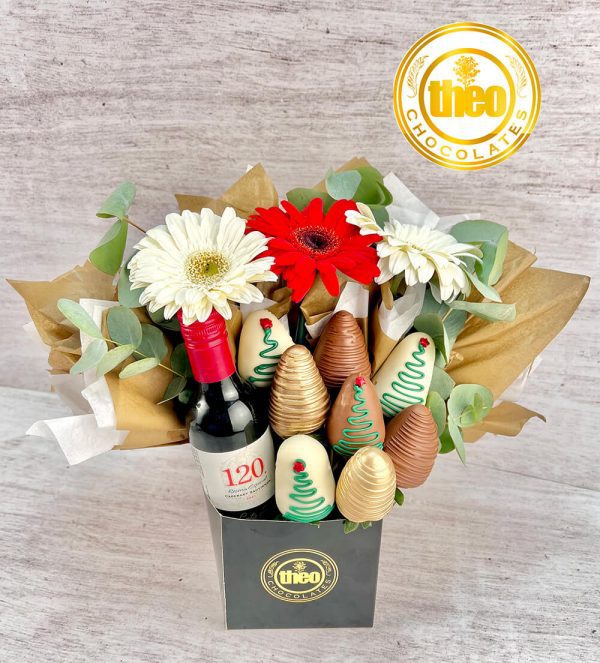 Arreglo con 8 fresas cubiertas con chocolate y con motivos navideños, 3 Gerberas naturales y una botellita de vino de 187 ml.