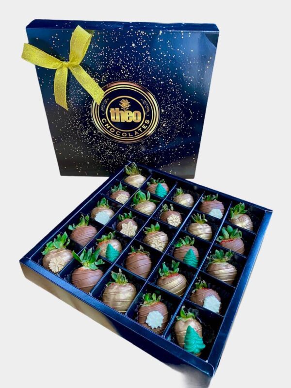Deliciosa caja con 25 fresas cubiertas con chocolate y decoradas con apliques navideños