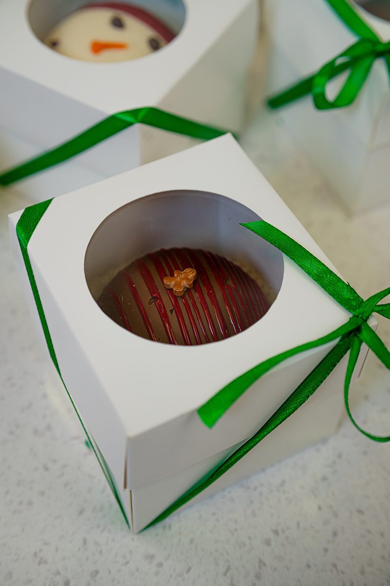 Bomba de chocolate de leche con relleno de cacao y mini marshmallows.