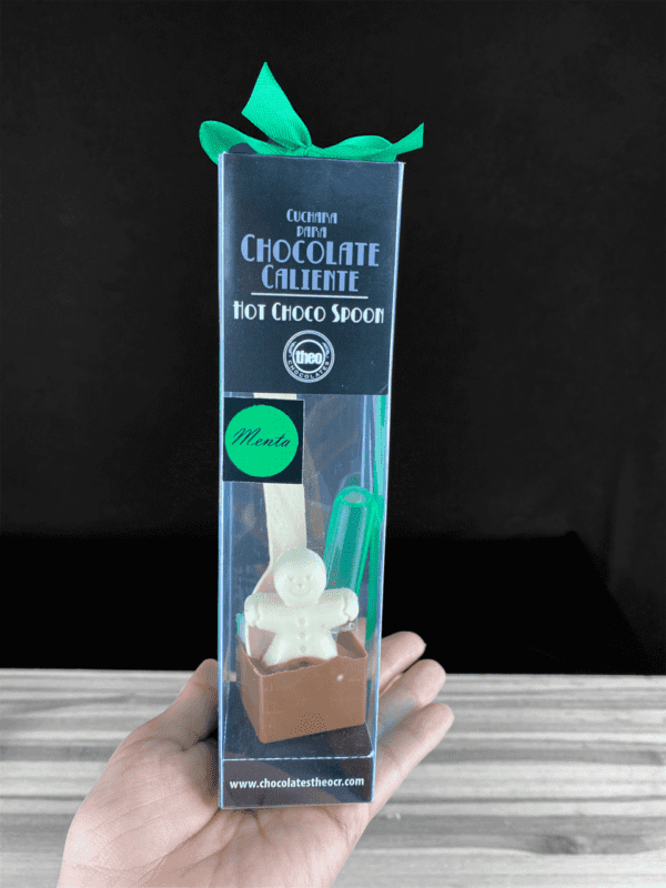 Cuchara para derretir y hacer chocolate caliente, hecha con chocolate de leche con 33% de cacao, un hombrecito de jengibre en chocolate blanco, mini marshmallows y un shot de licor de menta.