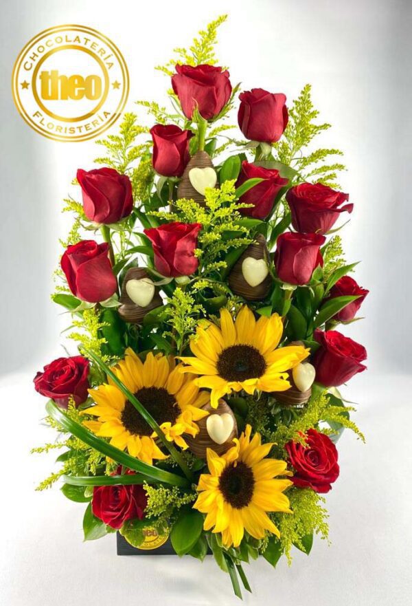 Arreglo con 12 rosas rojas, 3 girasoles y 5 fresas con chocolate y corazoncitos