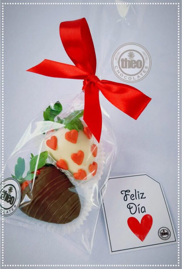 Un par de deliciosas fresas cubiertas y decoradas con chocolate y decoradas con corazoncitos, empacadas en bolsita y adornadas con un lazo de tela y colilla personalizada