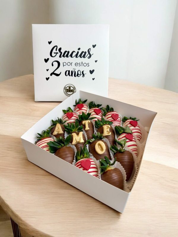 Caja personalizada con mensaje de aniversario con 16 fresas cubiertas con chocolate y con mensaje de “Te amo” en letras de chocolate.