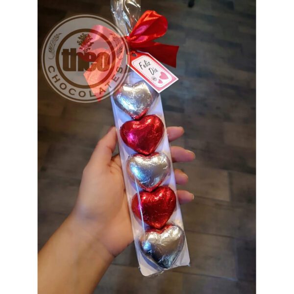 Paquete con 5 corazones de chocolate envueltos en papeles de colores adornados con lazo de tela y colilla