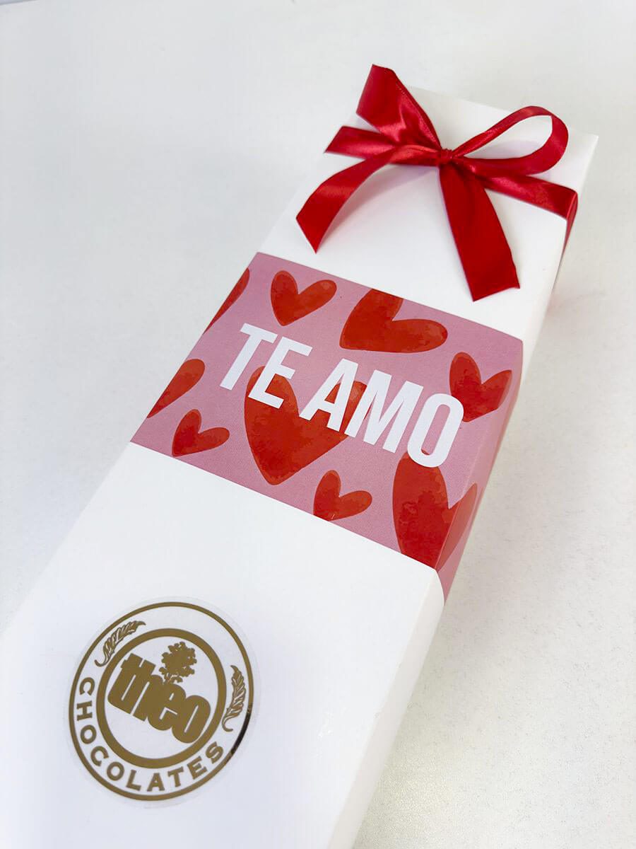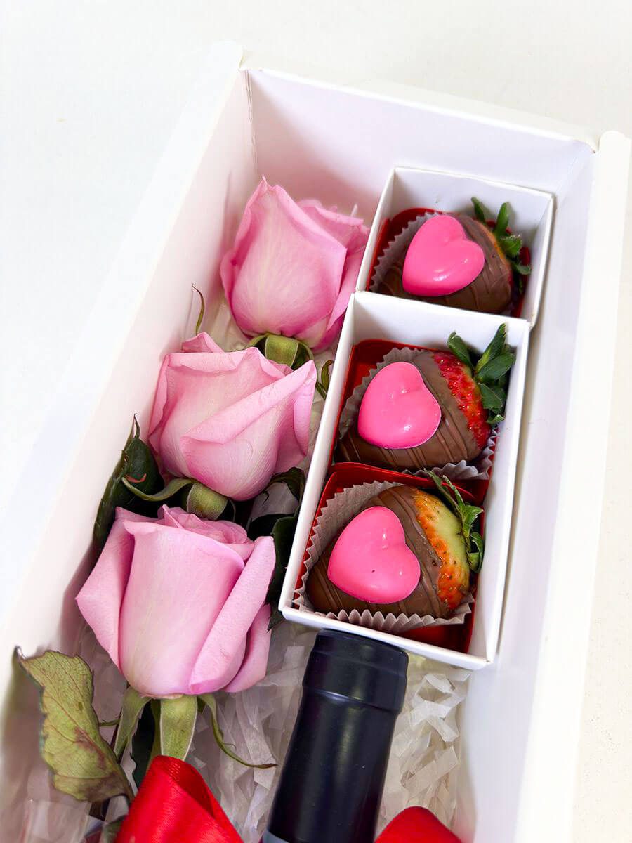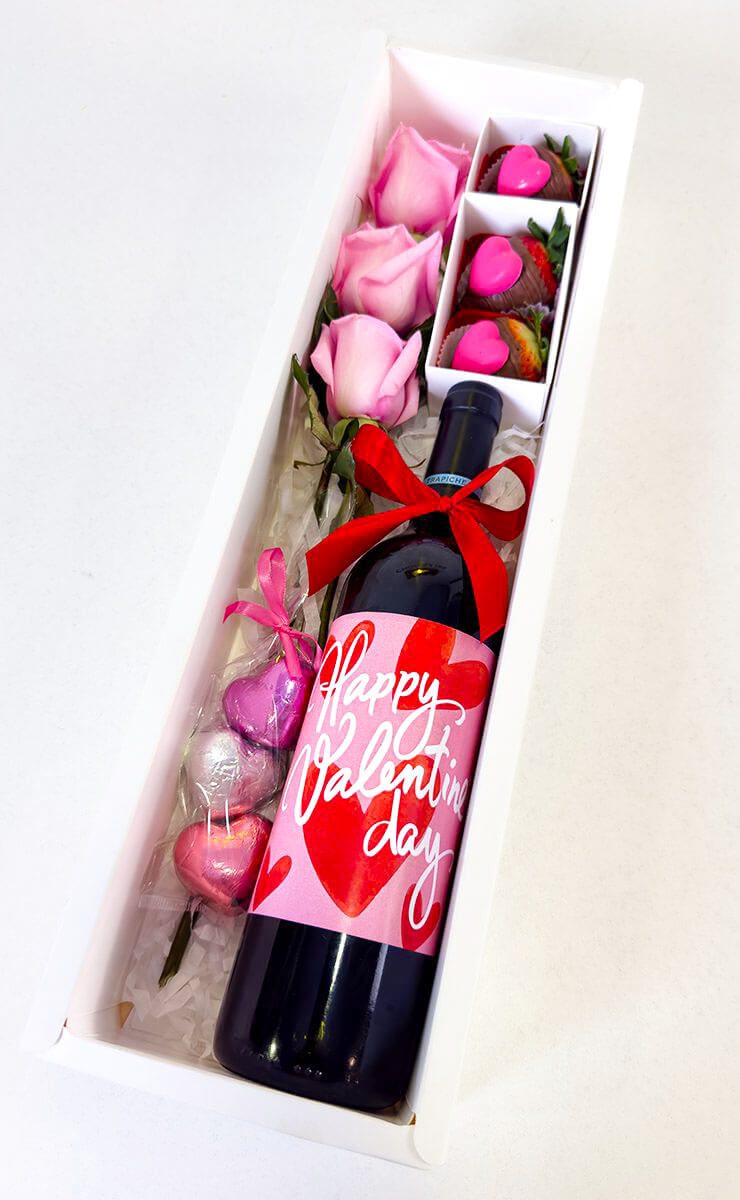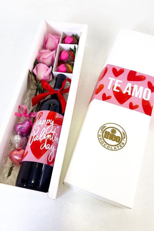 Caja de vino y fresas perfecta para compartir con tu persona especial y tener un día maravilloso. Esta detalle incluye un vino de 750ml con la etiqueta personalizada, tres fresas cubiertas de chocolate con apliques de corazones, tres corazones de chocolate y tres rosas rosadas. El empaque de este producto es una caja blanca de cartón rígido decorado con una etiqueta y lazo de tela.