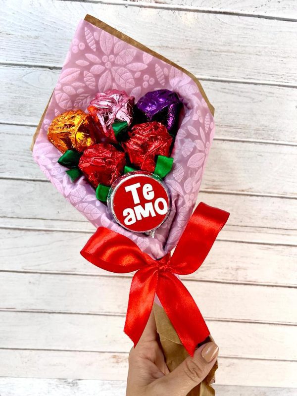 Ramo con 5 rosas de chocolate envueltas en papeles de colores y una paleta de chocolate en el centro con el mensaje “Te Amo”